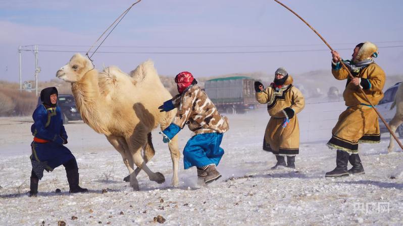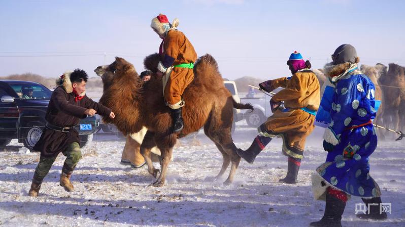 央广网锡林郭勒1月9日消息(记者刘欣荣)零下30℃的乌珠穆沁草原,冰封千里,寒风凛冽。1月8日,内蒙古锡林郭勒盟西乌珠穆沁旗草原“99号公路”冰雪季骆驼文化那达慕火热启幕,10余组牧民驯驼队轮番登场,一场尽显草原风情的驯驼比赛在冰封雪原上激情上演。