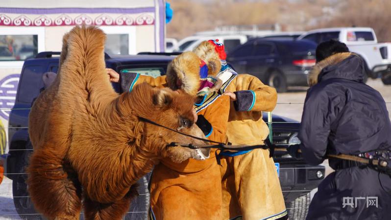 赛场上,牧民们身着传统服饰,与骆驼默契互动:引驼前行沉稳有力,挥鞭示意干脆利落,分工协作间,将传承千年的驯驼技艺演绎得淋漓尽致。凛冽寒风丝毫未减现场的热烈氛围,牧民与游客的欢呼声、清脆的驼铃声交织回荡,尽显草原冬日的独特风情与游牧豪情。
